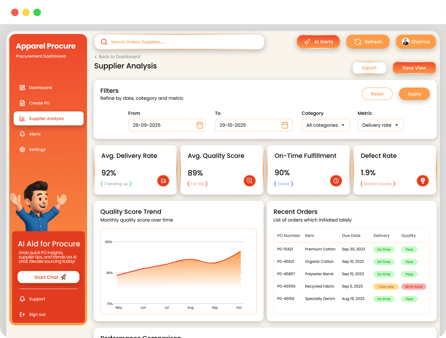 Custom date-based filters for supplier analysis. Selecting a specific timeline from calendar for view metrics, it enables targeted reviews. This improves accuracy by 25% in seasonal assessments, focusing on relevant data without sifting history