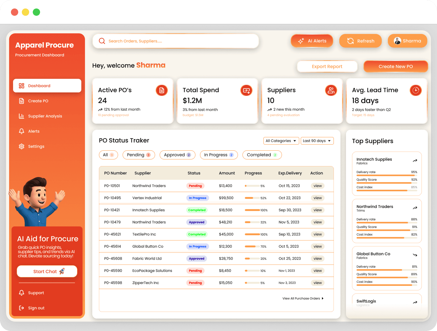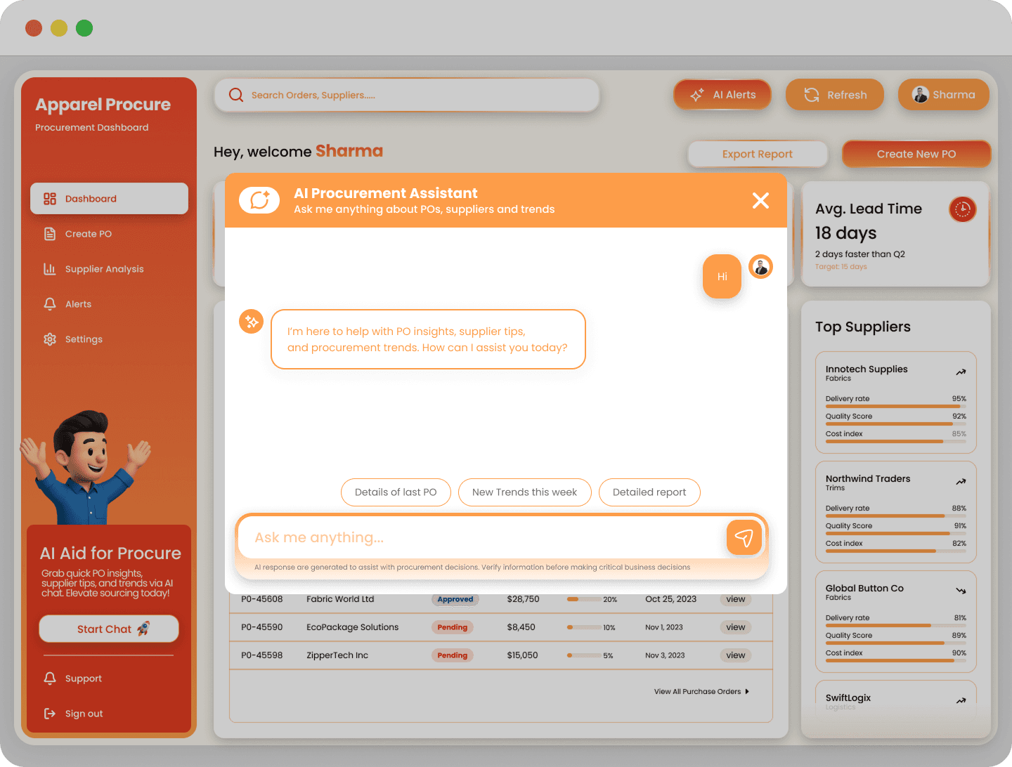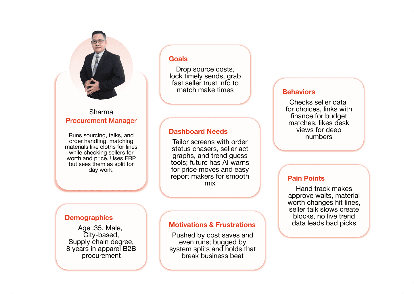 Businesses in the apparel industry face big challenges in B2B procurement due to outdated systems and disconnected workflows that slow material sourcing, costing an estimated $100 billion yearly. Key issues include approval cycles averaging 2-3 weeks from email delays, 15-20% overspend from poor visibility, and production delays from inefficient supplier coordination with 40+ emails and 48-72 hour spreadsheet lags. These manual processes heighten risks like compliance errors and inventory mismatches amid seasonal demands. Sharma, a procurement manager, struggles with delayed POs and unclear supplier metrics, needing a better solution.