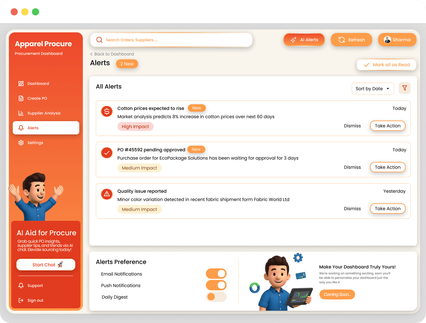 AI alerts forecast seasonal demands using last year's data. Analyzing patterns to predict 80% of needs, they trigger notifications like "Low stock for Q4 fabrics—reorder now." This prevents 89% peak delays, turning reactive firefighting into planned efficiency