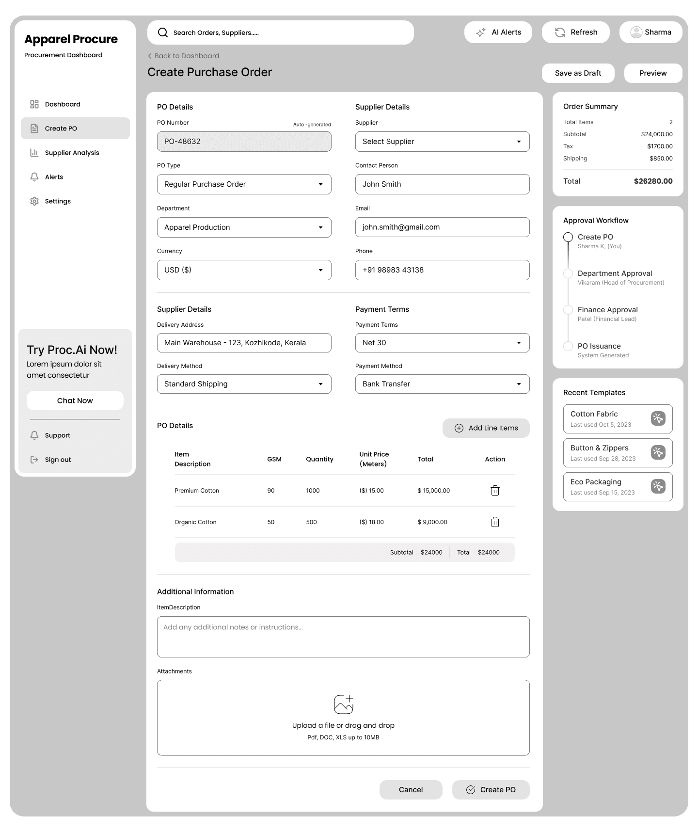 Framed recent PO Templates in PO creation screen to save time. Listing 2-3 templates for one-click loading and editing, it streamlines repetitive setups. This reduces creation from 10 minutes to 2, minimizing errors in high-volume tasks